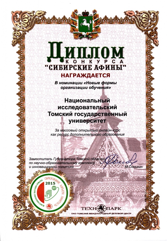 Институт дистанционного образования ТГУ принял участие и в 15-й Межрегиональной выставке-ярмарке «ОБРАЗОВАНИЕ. КАРЬЕРА. ЗАНЯТОСТЬ». На мероприятии состоялось награждение призеров конкурса «Сибирские Афины», и ИДО ТГУ – в их числе: институту вручен диплом конкурса в номинации «Новые формы организации обучения» за представление массовых открытых онлайн-курсов как ресурсов дополнительного образования.